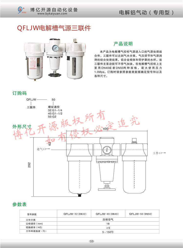 QFLJW氣源三聯(lián)件的接口從DN40-DN50不等,全部由內(nèi)螺紋安裝使用,主要用于電解車間電解槽前端的氣源控制部分,QFLJW-50為產(chǎn)品,更多的技術(shù)咨詢請(qǐng)聯(lián)系本公司技術(shù)部:0371-85612788。
