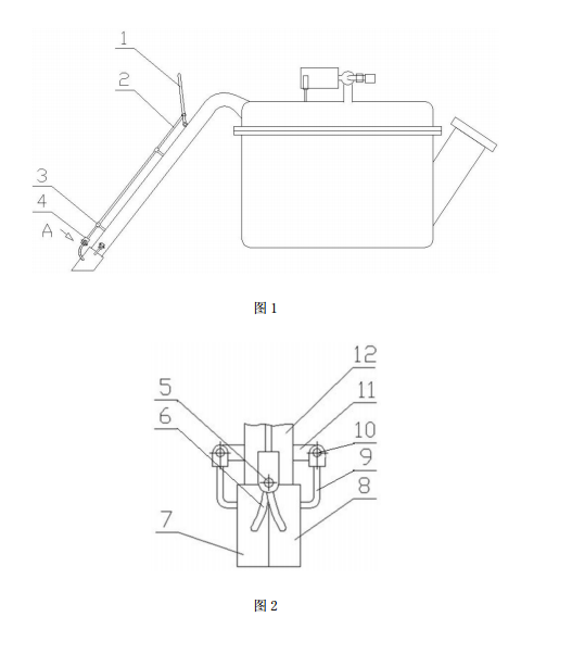 如圖 1 和 2 所示的一種吸鋁管帶開(kāi)閉裝置的出鋁抬包,包括手動(dòng)操縱桿1,拉桿2,導(dǎo)向套筒3,叉頭4,銷軸Ⅰ 5,開(kāi)口銷Ⅰ 6,左管套7,右管套8,銷軸Ⅱ 9,開(kāi)口銷Ⅱ 10,耳座11,吸鋁管12等組成。如圖1,圖2所示。手動(dòng)操縱桿1一端鉸接固定在吸鋁管12上,中間通過(guò)銷軸9與拉桿2鉸接,拉桿2的一端頭與叉頭4固定,拉桿2通過(guò)導(dǎo)向套筒3進(jìn)行軸向定位導(dǎo)向,左管套7、右管套8 通過(guò)銷軸Ⅰ 5 和開(kāi)口銷Ⅰ 6 與叉頭4鉸接,左管套7和右管套8自帶的叉頭通過(guò)銷軸Ⅱ 9 和開(kāi)口銷Ⅱ 10 與耳座11鉸接,耳座11焊接在吸鋁管12 上。當(dāng)手動(dòng)操縱桿1向下扳動(dòng),拉桿2通過(guò)叉頭4將左管套7和右管套8推動(dòng),左管套7和右管套8分別圍繞銷軸9轉(zhuǎn)動(dòng),此時(shí)完成裝置的開(kāi)啟動(dòng)作;當(dāng)手動(dòng)操縱桿1向上扳動(dòng),拉桿2通過(guò)叉頭4將左管套7和右管套8拉動(dòng),左管套7和右管套8分別圍繞銷軸9轉(zhuǎn)動(dòng),此時(shí)完成裝置的關(guān)閉動(dòng)作。