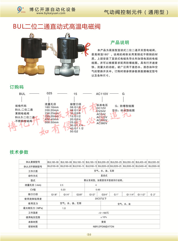 【產(chǎn)品名稱】:BUL二位二通高溫電磁閥