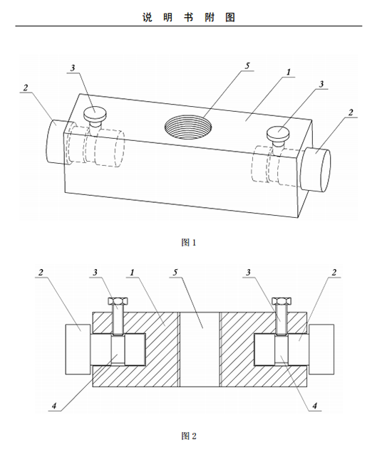 實(shí)施例一:參見圖1和圖2,該夾緊接頭用于快速鏈接電解槽上母線與導(dǎo)桿組,包括方套1和軸頭2,在方套1兩端分別設(shè)置有軸孔,兩軸頭2分別匹配套裝在兩個(gè)軸孔內(nèi),軸頭2的中部設(shè)置有環(huán)形凹槽4,在方套1側(cè)面設(shè)置有用于鎖緊軸頭的鎖定螺釘3,所述鎖緊螺釘3匹配插入該環(huán)形凹槽4內(nèi)。方套1的中心設(shè)置有用于固定的螺紋孔5。