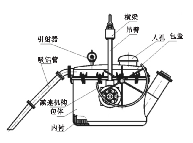 大型真空抬包主要由包體、包蓋、內(nèi)襯、吊臂、減速結(jié)構(gòu)、引射器、吸鋁管組成。